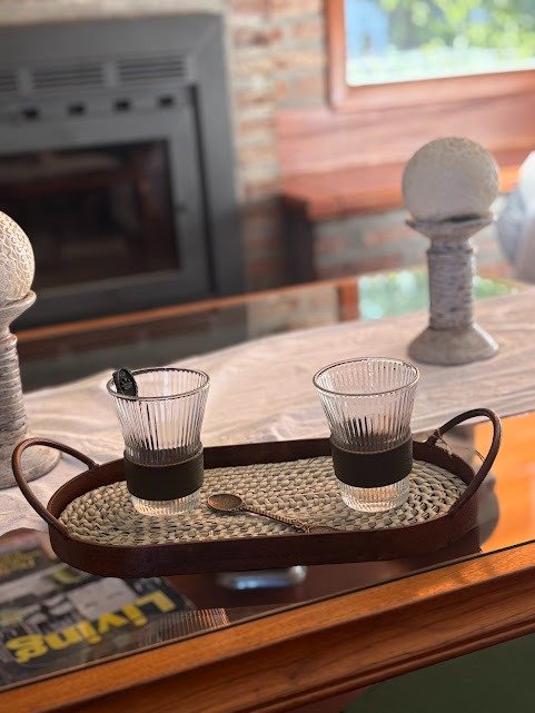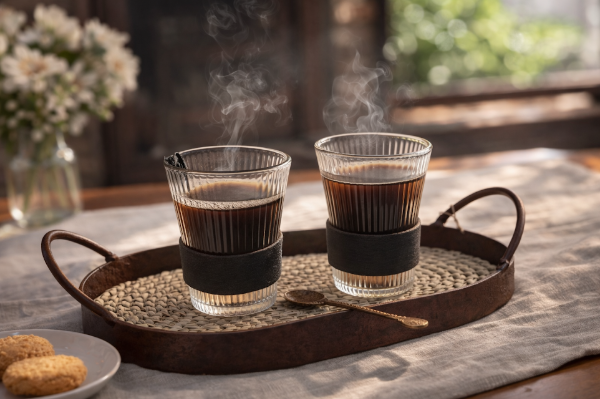 Tazas de vidrio para café con agarradera imitación cuero